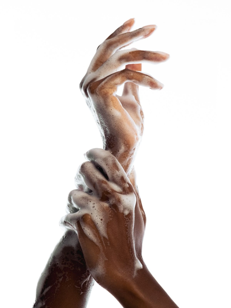 Com as mãos molhadas, deslize o sabonete e observe a espuma se formar. Sinta a textura, o toque e o perfume se espalhando no ar.